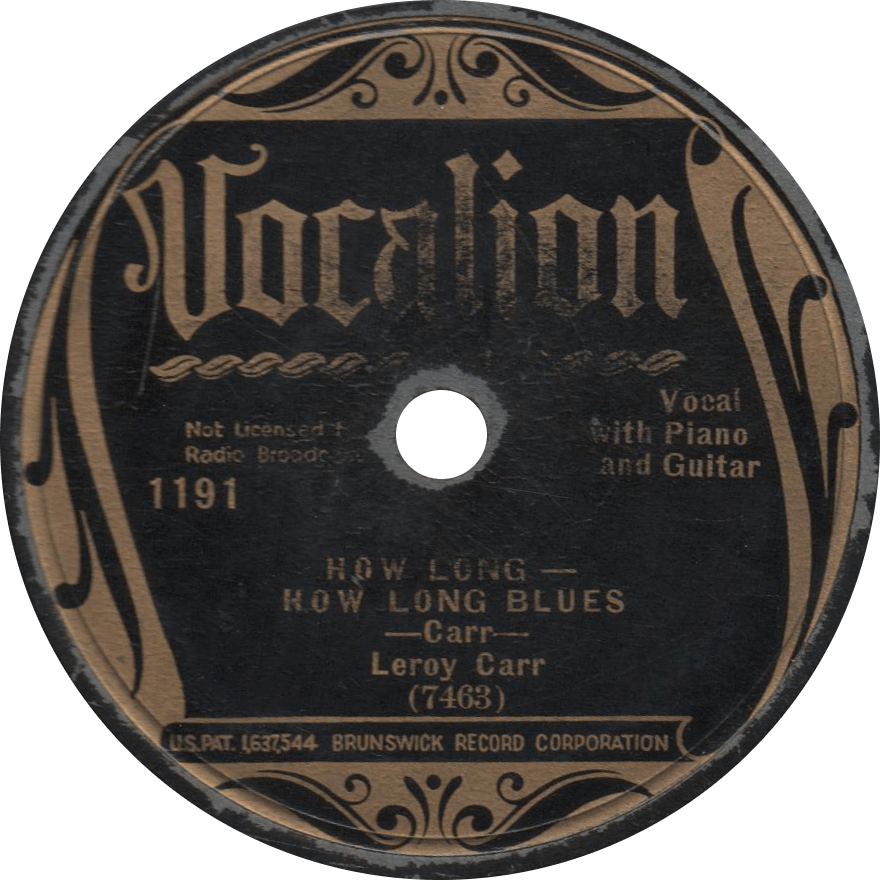 Vocalion 1191 was recorded on June 19, 1928 in Indianapolis, Indiana by Leroy Carr, singing and piano, backed by Scrapper Blackwell on guitar. It was Carr and Blackwell’s first record, together or separately. This copy was pressed in 1935 or ’36, as indicated by the black and gold “scroll” style label. It was also reissued on Banner 32557, Oriole 8166, and Romeo 5166. That it was still for sale nearly a decade after it was originally made—combined with its well-worn condition—present a testament to just how popular this record was.
