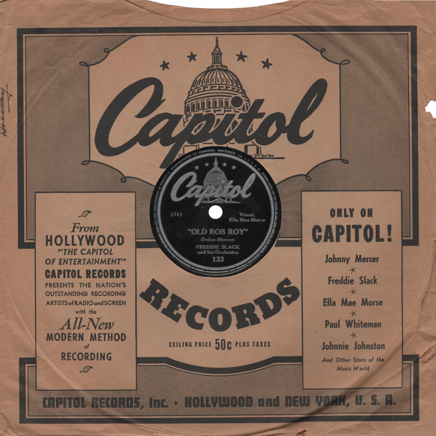Capitol RecordsCapitol Records was founded in 1942 by lyricist and singer Johnny Mercer and songwriter Buddy DeSylva. The label was very successful and continues to produce records today. Capitol is known to have issued several special edition 78 RPM records long after the 78 era had ended.
