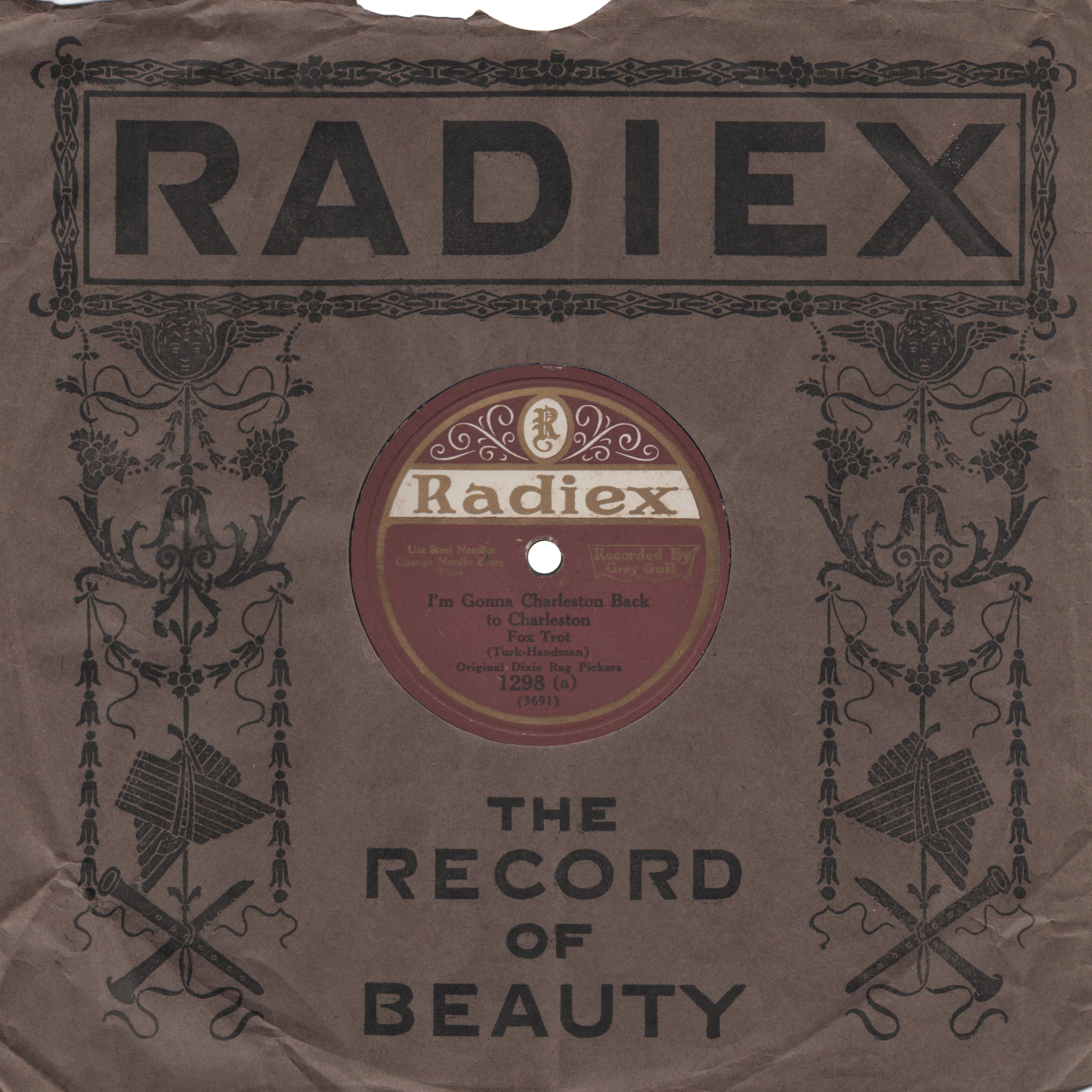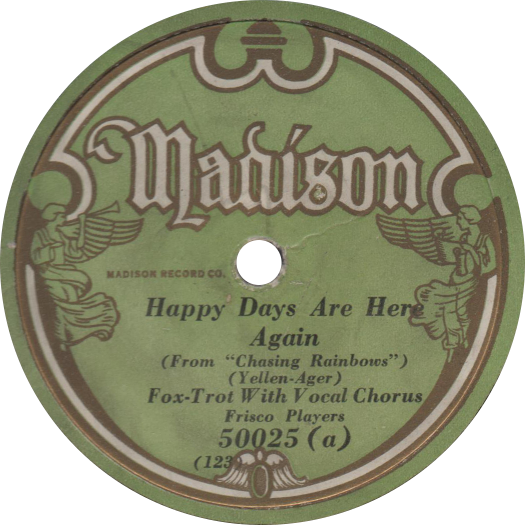 Grey GullGrey Gull Records was founded in 1919 by Theodore Lyman Shaw. The company initially offered high quality vertically cut records, but they were soon replaced by a line of equally high priced lateral cut records that eventually became the low priced, low quality type of record that Grey Gull became known for. Grey Gull recordings often employed a studio band to play popular dance tunes, and often used various pseudonyms for the studio band and others, such as the "Frisco Players", as seen on the Madison label shown here.