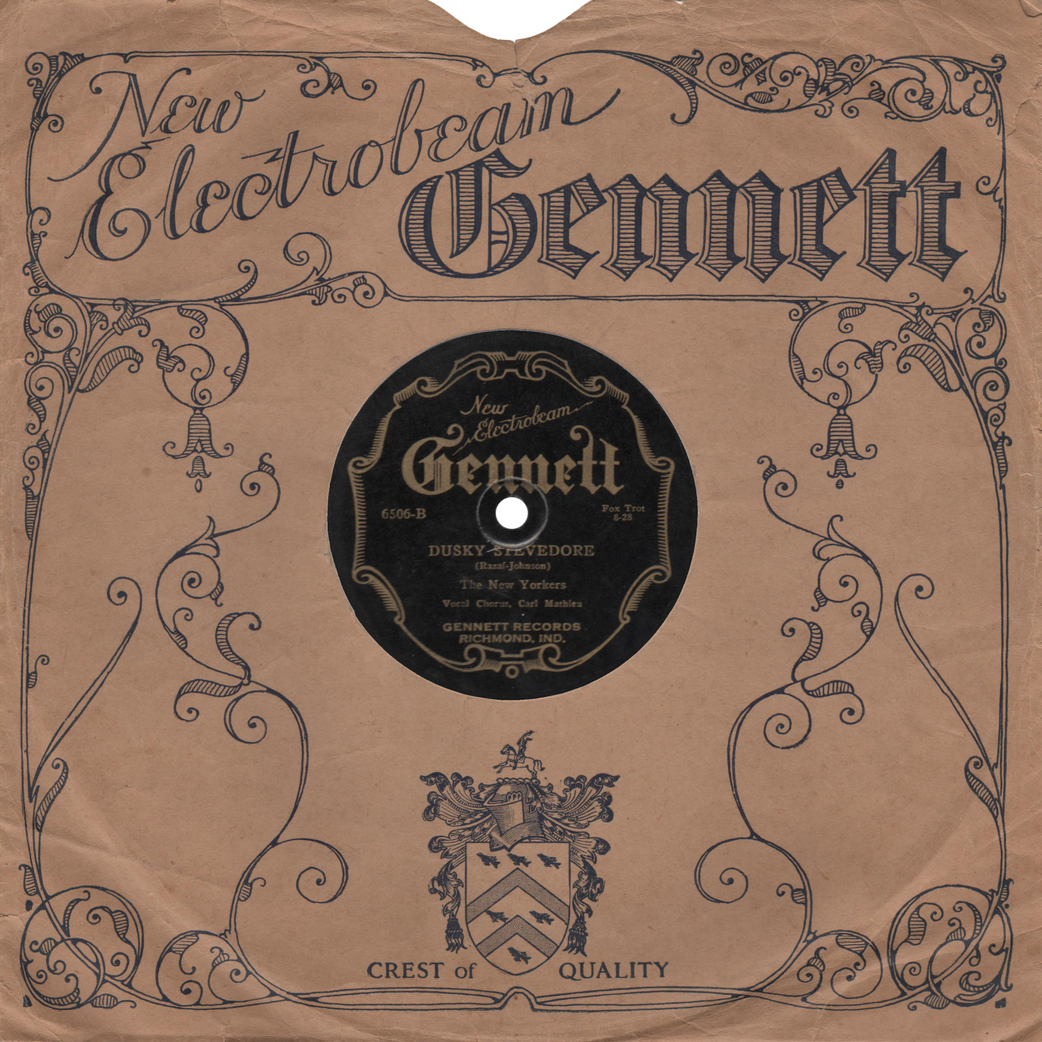 Gennett RecordsGennett records were produced by the Starr Piano Company of Richmond, Indiana, beginning with vertically cut records in 1917. Gennett began producing laterally cut records in 1919. Throughout their history, Gennett had the distinction of recording some of the foremost jazz personalities of the day, including King Oliver, Jelly Roll Morton, and Bix Beiderbecke, as well as many great territory bands that would not have been heard otherwise. After some crude electric records produced by Marsh Labs in 1925, Gennett began their "Electrobeam" line of electrically recorded records in 1927.