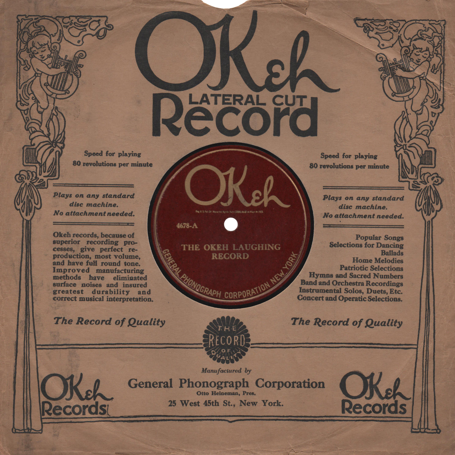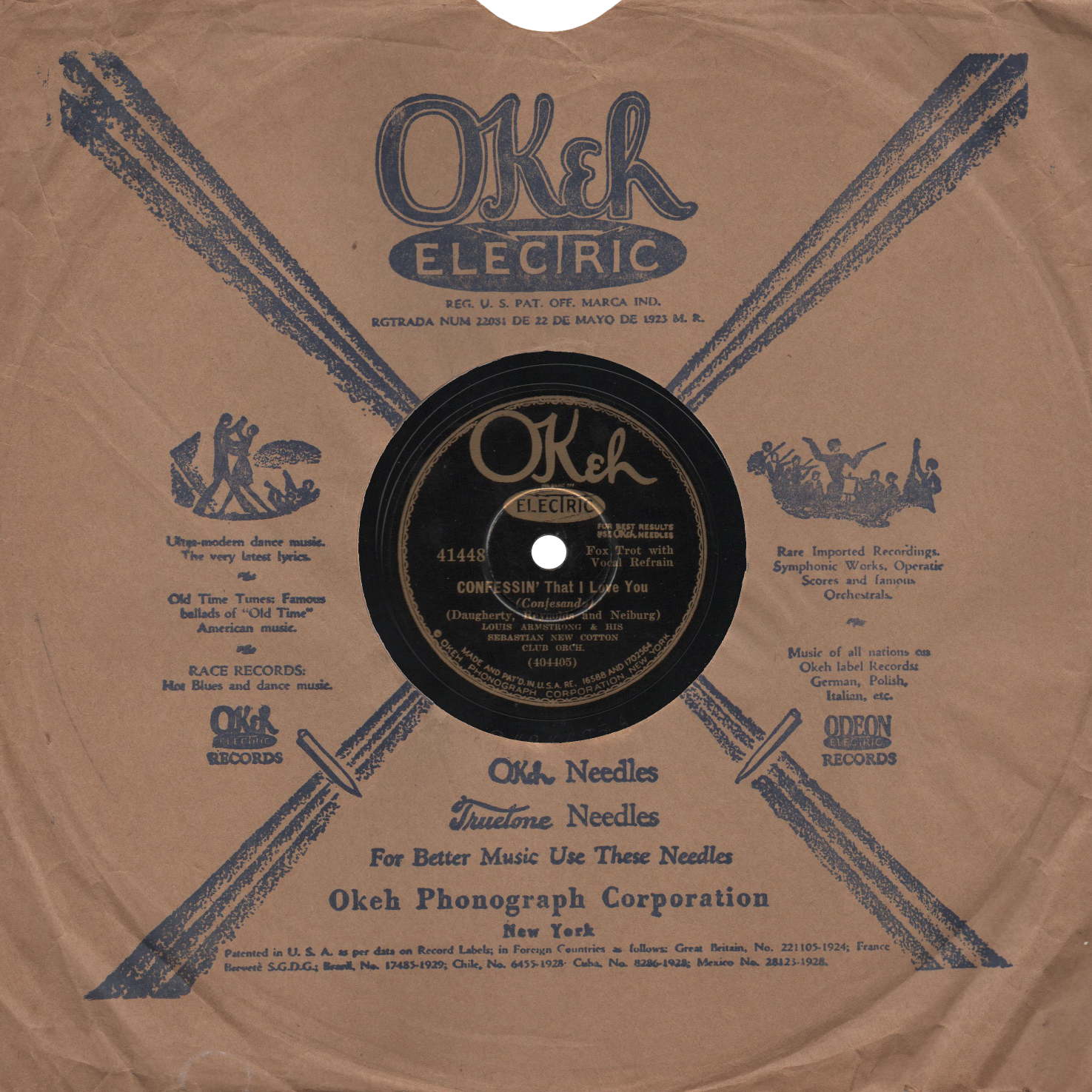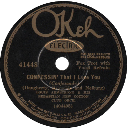 Okeh RecordsThe Okeh Record Company (pronounced "O-K") was founded in 1916 by Otto Heinemann, a manager of the US branch of Odeon Records. Okeh's first records were vertically cut, but they switched to the more prevalent lateral cut in 1919. After a successful run of records by blues singer Mamie Smith in 1920, Okeh started making the first "Race" records in 1922 and recorded a great number of early jazz and blues from top black performers of the day including the great King Oliver. Several years after Oliver's Okeh recordings, his protégé Louis Armstrong made a string of landmark jazz records for Okeh. In 1926, Okeh switched to electrical recording and was purchased by Columbia records. The label gradually disappeared by 1935 with Columbia's instability. After the CBS buyout of Columbia, the Okeh division was re-launched in 1940, continuing until 1946, and again in 1951.